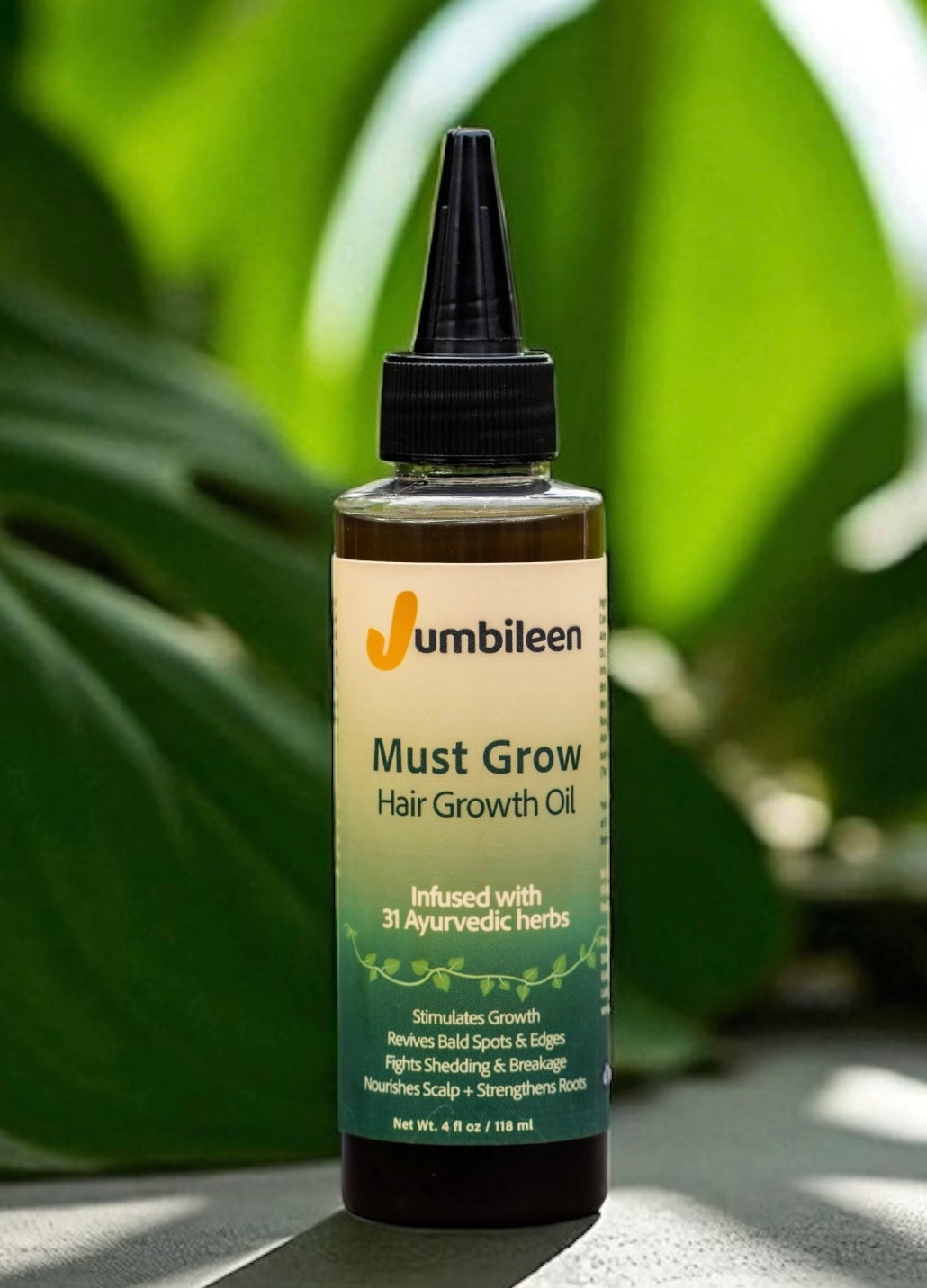 Stronger, thicker, healthier hair starts here. Jumbileen's Must Grow Hair Growth Oil is a potent, nutrient-rich blend of cold-pressed oils and 31 Ayurvedic herbs crafted to deeply nourish the scalp, stimulate growth, and strengthen every strand from root to tip.