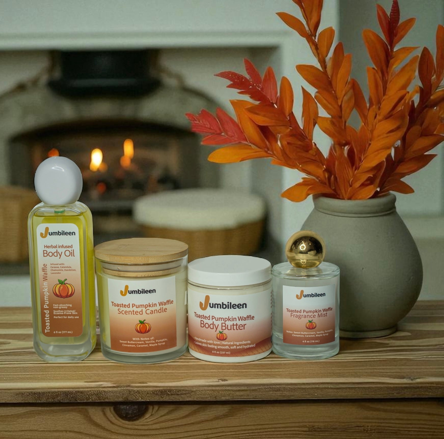 Our Toasted Pumpkin Waffle Collection includes everything you need to layer your scent and glow all season long: Herbal-Infused Body Oil, Body Butter, Candle, Fragrance Mist.